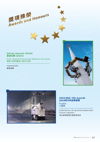 Edison Awards (2024) 愛迪生獎 (2024) Silver Award (Innovative Robotics Solution) 銀獎 (創新機械人解決方案) InspecSpider 攀影蜘蛛 2024 R&D 100 Awards 2024百大科技研發獎 Finalist 入圍者 Autonomous Air-ground Cooperative Tunnel Inspector 地空協同隧道自動檢測系統 年報 ANNUAL REPORT 2024-25 27