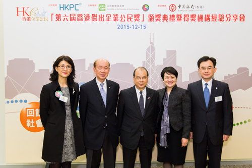 The awards presentation ceremony is a highlight of “The 6th Hong Kong Corporate Citizenship Program” organized by the Hong Kong Productivity Council (HKPC), co-organized by the Committee on the Promotion of Civic Education (CPCE), and sponsored by the Bank of China (Hong Kong) (BOCHK).